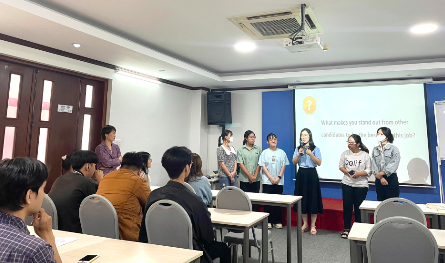🎯Cuối cùng, các bạn sinh viên được học hỏi nhiều kinh nghiệm về kỹ năng phỏng vấn được dẫn dắt bởi Trainer Thanh Trúc. Các bạn được làm việc nhóm cùng nhau giải quyết một số tình huống thực tế dưới sự hướng dẫn của chị Thanh Trúc.